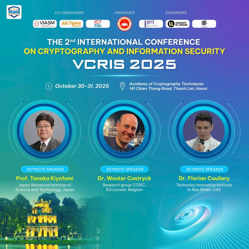 Hội thảo VCRIS 2025 được Ban Cơ yếu Chính phủ bảo trợ, do Học viện Kỹ thuật mật mã chủ trì, phối hợp tổ chức cùng Viện Nghiên cứu cao cấp về Toán (VIASM), Tạp chí An toàn thông tin (ISJ), Câu lạc bộ các Khoa - Trường - Viện Công nghệ thông tin - Truyền thông Việt Nam (FISU), dưới sự bảo trợ chuyên môn từ: Viện Khoa học Công nghệ tiên tiến Nhật Bản (JAIST), Đại học Lorraine - Pháp, Nhóm nghiên cứu Computer Security and Industrial Cryptography (COSIC), Đại học KU Leuven, Bỉ.