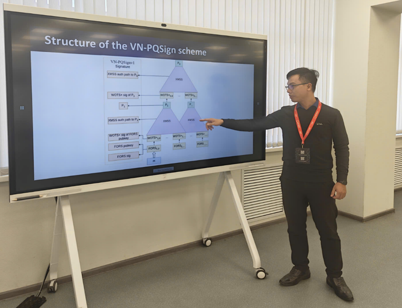 Bên cạnh đó, tham luận cũng giới thiệu dự thảo tiêu chuẩn quốc gia TCVN cho thuật toán chữ ký số hậu lượng tử VN-PQSIGN do Ban Cơ yếu Chính phủ chủ trì nghiên cứu. Nhóm nghiên cứu đã đánh giá các tham số an toàn và xây dựng các nhóm tham số phù hợp với nhiều kịch bản ứng dụng như ký số cá nhân, ký số tổ chức và ký số tập trung sử dụng thiết bị HSM. Kết quả nghiên cứu đang được tiếp tục hoàn thiện để xây dựng tiêu chuẩn quốc gia TCVN đối với VN-PQSIGN và dự kiến trình ban hành trong thời gian tới. Tham luận đã nhận được sự quan tâm và trao đổi của nhiều nhà khoa học, chuyên gia tham dự hội thảo.