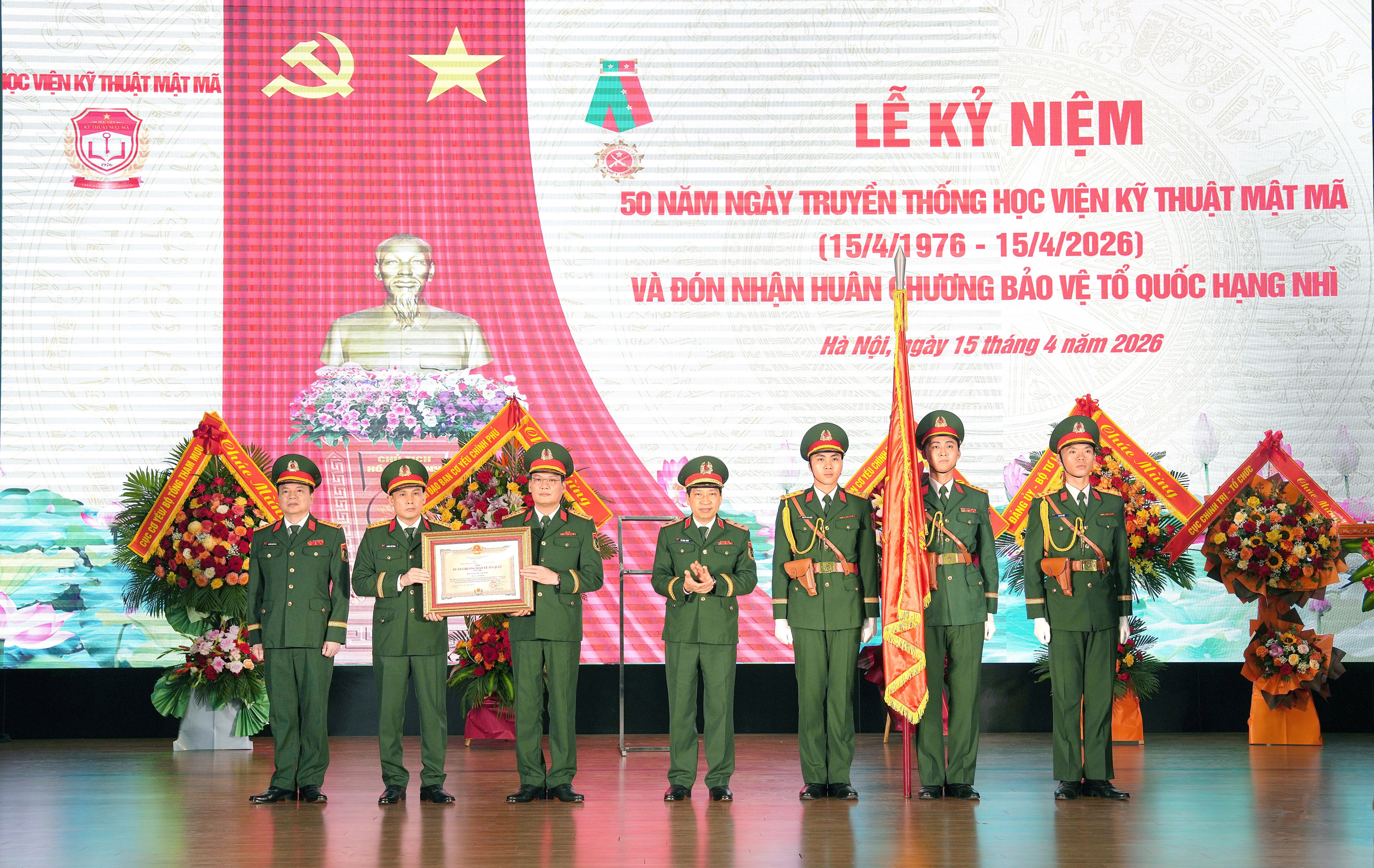Một trong những điểm nhấn quan trọng của buổi Lễ là chương trình trao tặng Huân chương Bảo vệ Tổ quốc hạng Nhì cho Học viện Kỹ thuật mật mã. Đây là phần thưởng cao quý, thể hiện sự ghi nhận và đánh giá cao của Đảng, Nhà nước đối với những thành tích, đóng góp quan trọng mà tập thể cán bộ, giảng viên, nhân viên, Học viên Học viện Kỹ thuật mật mã đã đạt được trong suốt hành trình 50 năm xây dựng và phát triển.