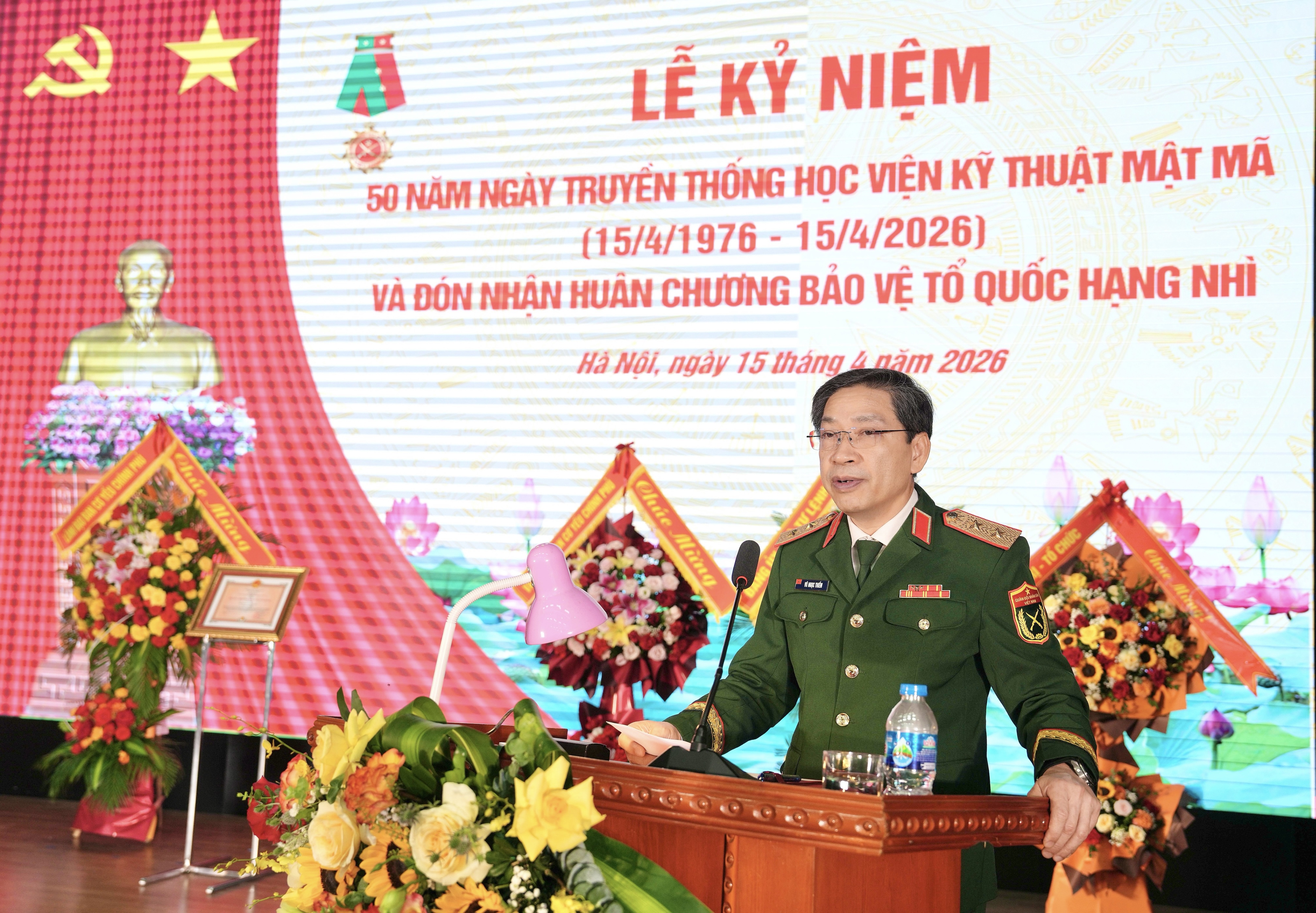 Phát biểu chỉ đạo tại buổi Lễ, đồng chí Trung tướng Vũ Ngọc Thiềm ghi nhận và biểu dương những thành tựu nổi bật mà Học viện Kỹ thuật mật mã đã đạt được trong 50 năm qua, khẳng định Học viện luôn giữ vai trò là trung tâm đào tạo, nghiên cứu khoa học - công nghệ nòng cốt của ngành Cơ yếu Việt Nam.
